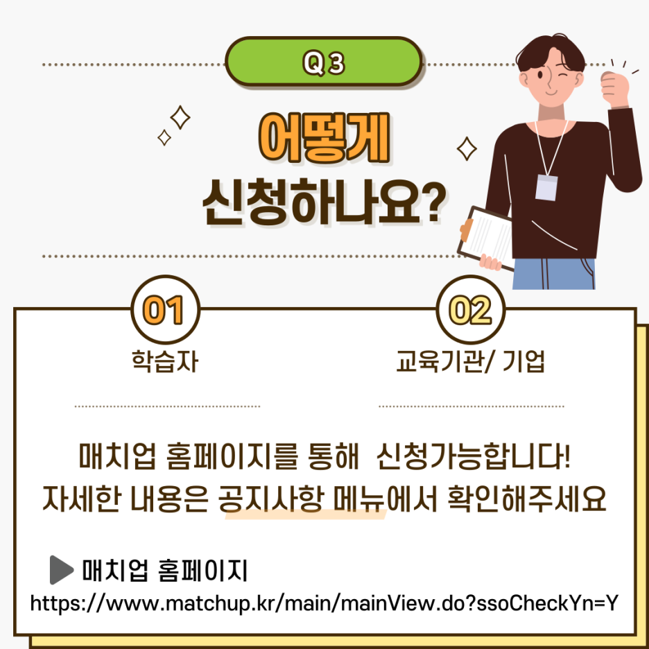 매치업 운영 분야 관련 기업만이 사업에 지원할 수 있는데요. VR/AR, 대체 에너지, 드론 등 4차 산업 분야 대표기업들이 신청대상입니다. 신청을 희망하는 기업은 산업체 혹은 교육기관 간 협의체를 구성해 사업에 참여할 수 있습니다. 산업체와 조직을 구성할 경우 1개 기업을 주관기업으로 지정해 신청해야 하는데요. 고용노동부, 중소벤처기업부 등 정부 예산으로 교육프로그램을 운영하는 산업체의 경우엔 관련 부처와 사전 협의 후 신청해야 한다는 점 잊지 마세요! 신청서 양식은 매치업 사이트에 접속해 공지사항 메뉴에 들어가면 다운로드받을 수 있습니다.