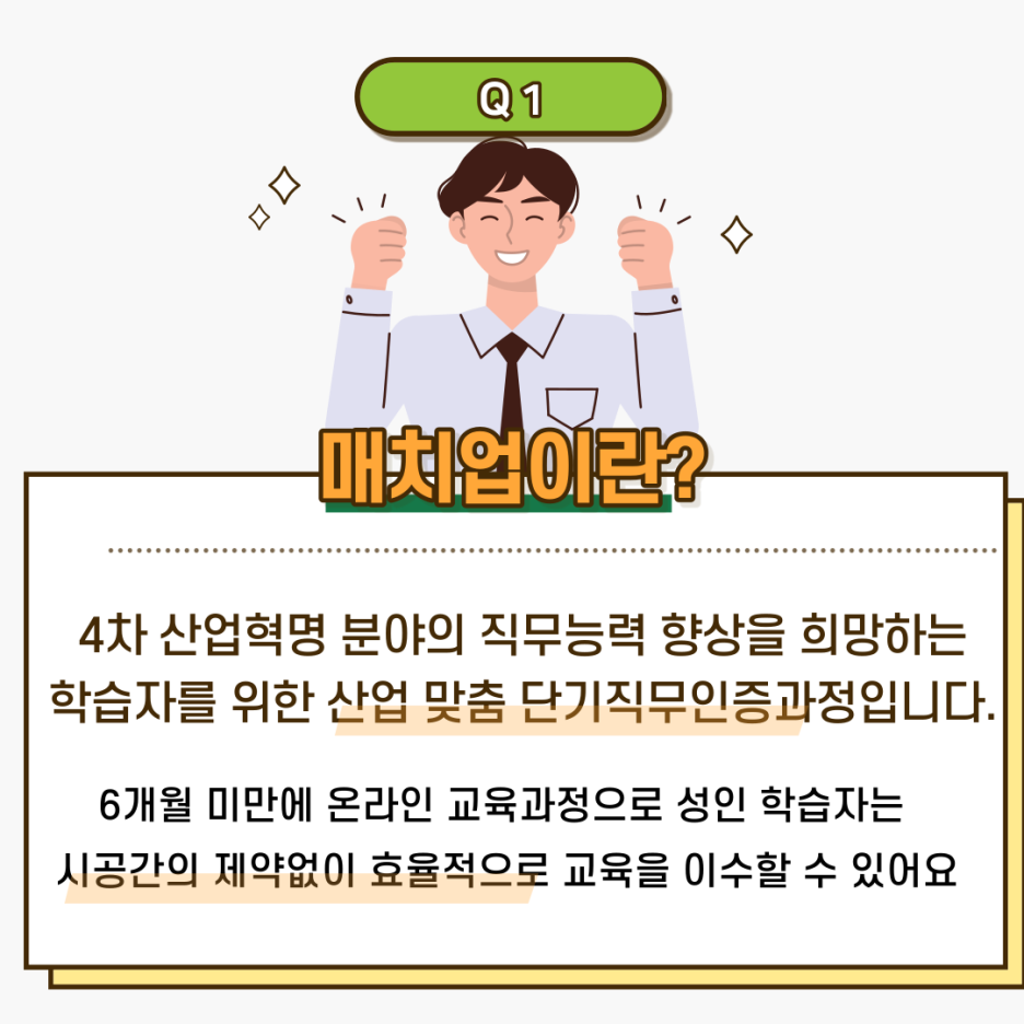 A1. 4차 산업혁명 분야의 직무능력 향상을 희망하는 학습자를 위한 산업 맞춤 단기직무인증과정입니다. 기업과 교육기관이 연계해 핵심 직무 중심으로 특성화된 교육프로그램을 개발하고 운영하는데요. 6개월 미만에 온라인 교육과정으로 성인 학습자는 시공간의 제약 없이 효율적으로 교육을 이수할 수 있어요. 온라인 수업이라고 해서 관리가 허술하지 않을까 고민이시라고요? 국가평생교육진흥원이 직접 성과평가를 시행하며 프로그램의 품질관리를 하고 있으니 걱정하지 마세요.