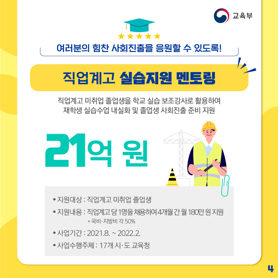 ✔ 지원내용 : 직업계고 당 1명을 채용하여 4개월 간 월 180만 원 지원