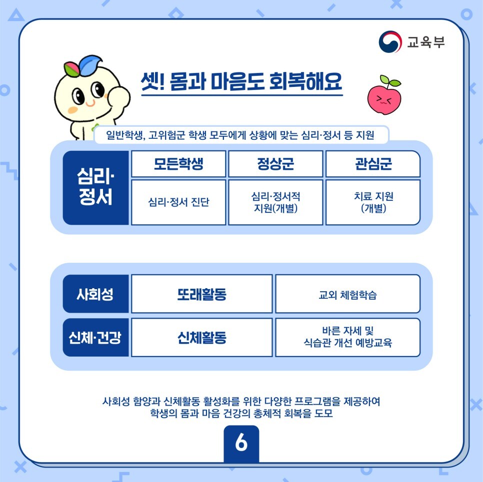 ✔ 사회성 함양과 신체활동 활성화를 위한 다양한 프로그램을 제공, 학생의 몸과 마음 건강의 총체적 회복 도모