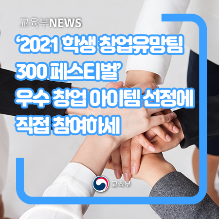 교육부(부총리 겸 교육부장관 유은혜)와 과학기술정보통신부(장관 임혜숙, 이하 과기정통부)는 한국연구재단(이사장 노정혜), 한국청년기업가정신재단(이사장 황철주)과 함께 ‘2021 학생 창업유망팀 300 페스티벌’을 개최한다.