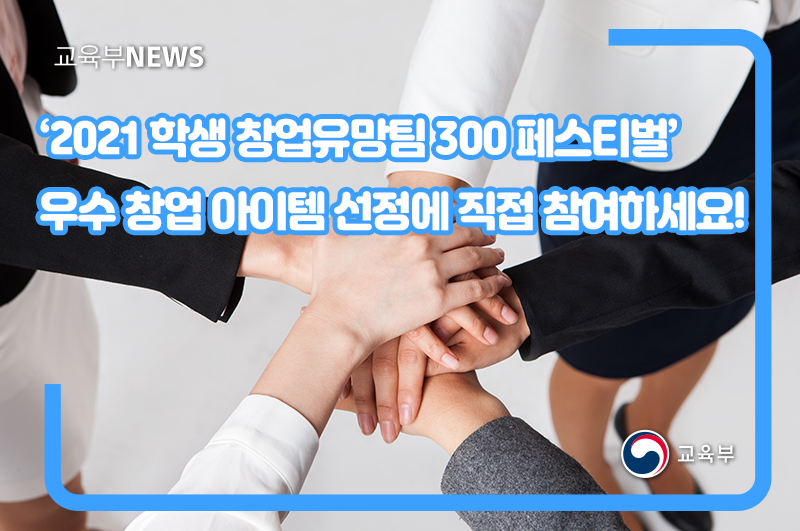교육부(부총리 겸 교육부장관 유은혜)와 과학기술정보통신부(장관 임혜숙, 이하 과기정통부)는 한국연구재단(이사장 노정혜), 한국청년기업가정신재단(이사장 황철주)과 함께 ‘2021 학생 창업유망팀 300 페스티벌’을 개최한다.