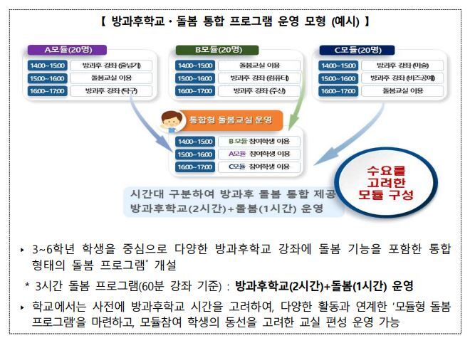 돌봄 확대 및 다양한 활동 중심의 돌봄 수요 충족을 위해 방과후학교와 돌봄이 통합되어 하나의 프로그램으로 운영되는 ‘방과후학교·돌봄 통합 프로그램’을 제공한다.