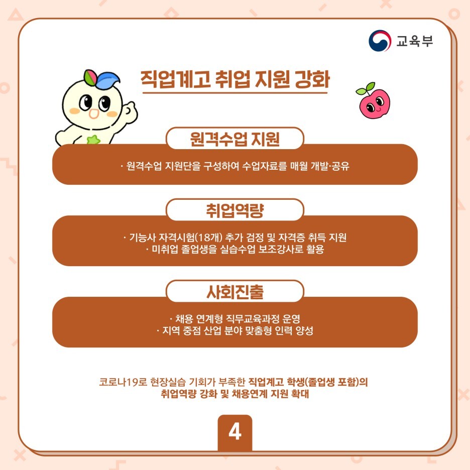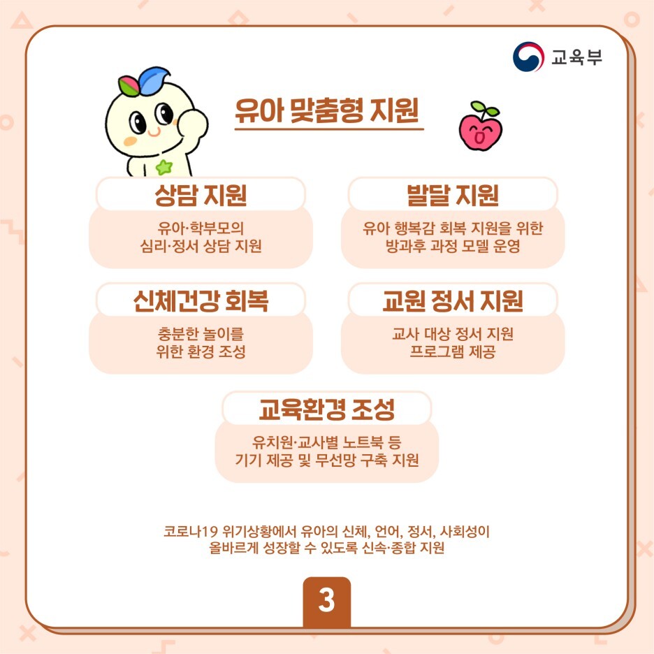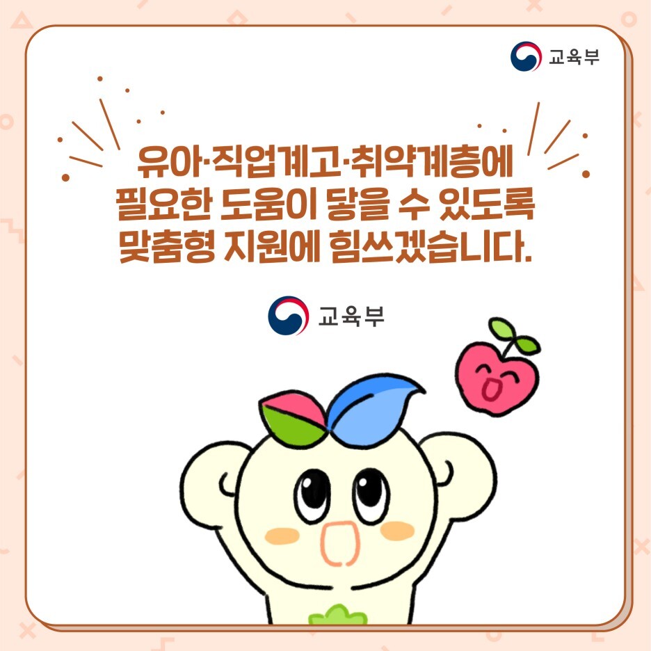 코로나19 상황 속에서 더욱 어려움을 겪는 유아·직업계고·취약계층에게 맞춤형으로 촘촘하게 지원합니다!