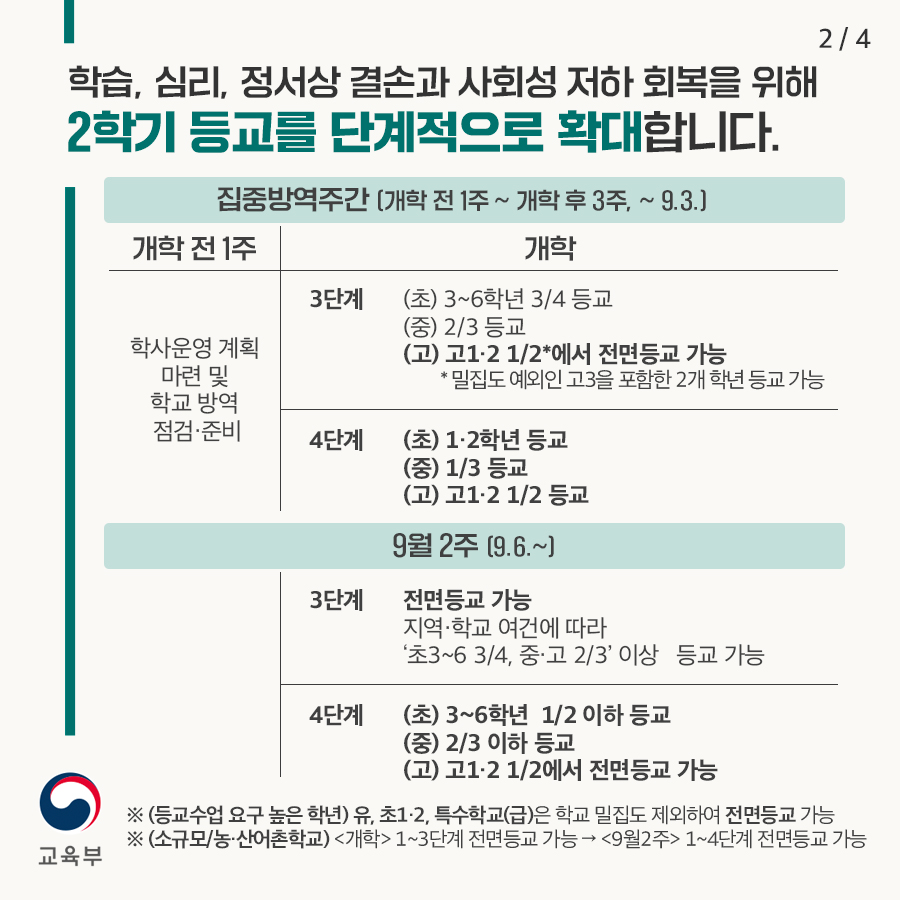 | 4단계 | (초) 1·2학년 등교 (중) 1/3 등교 (고) 고1·2 1/2 등교 |