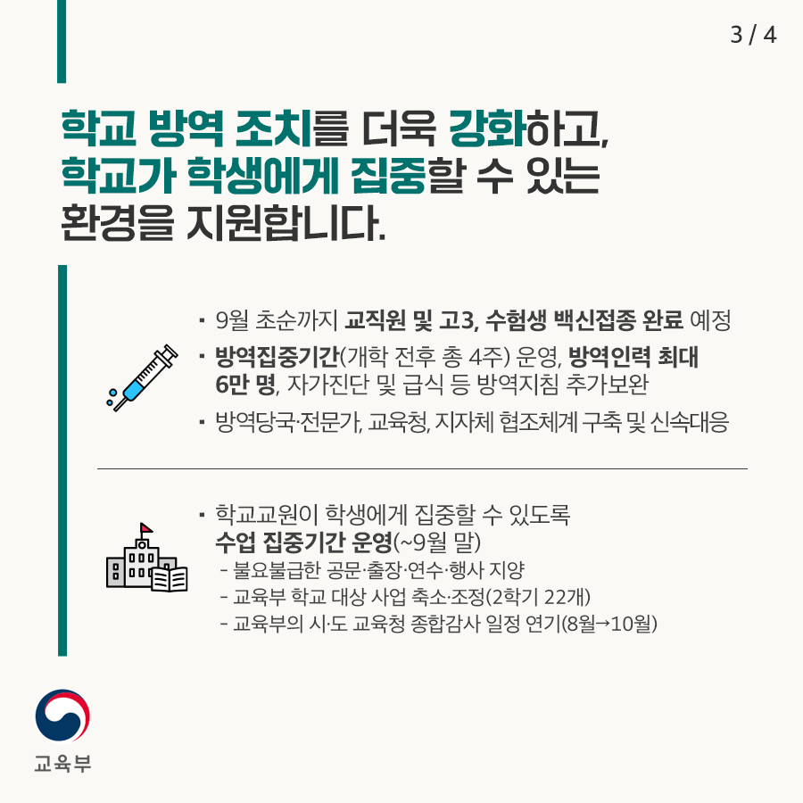 ◎ 9월 초순까지 교직원 및 고3, 수험생 백신접종 완료 예정