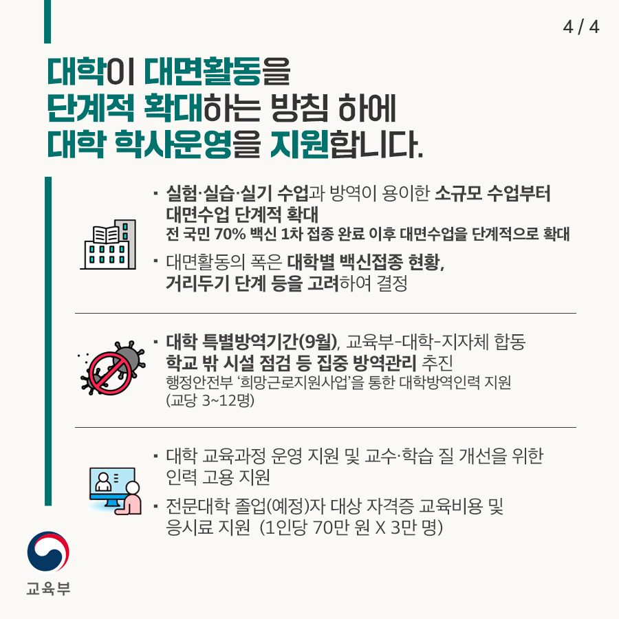 대학이 대면활동을 단계적 확대하는 방침 하에 대학 학사운영을 지원합니다.