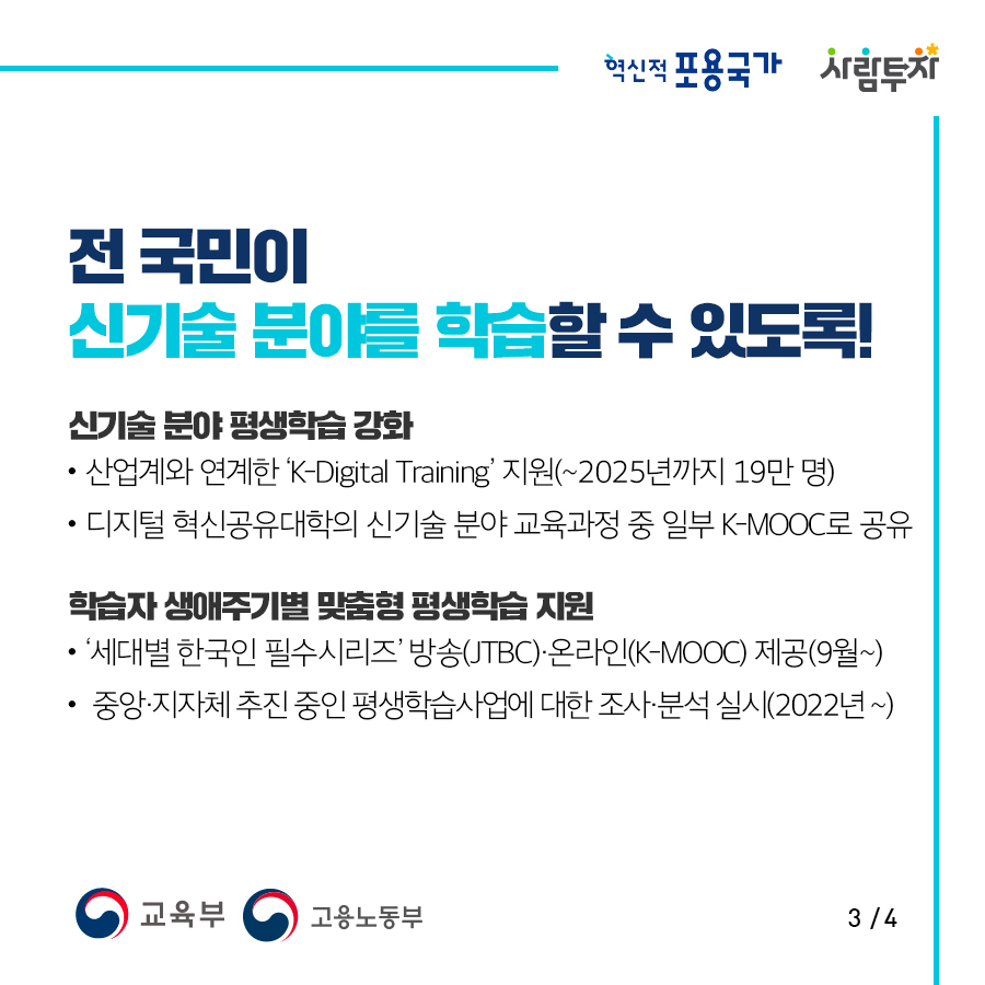 - 산업계와 연계한 'K-Digital Training' 지원(~2025년까지 19만 명)