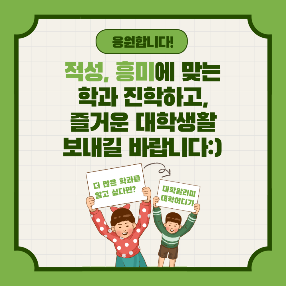 이렇게 다양한 학과에 대해서 살펴보았는데 다들 어떠셨나요? 흥미가 있는 학과가 있다면 각 대학 홈페이지를 방문하여 학과에 대한 더 자세한 정보를 찾아보아도 좋을 것 같습니다! 또한, 더 다양한 학과를 알아보고 싶다면, “대학 알리미”와 "대학 어디가"라는 사이트를 활용해보세요! 대학 알리미에서는 총 1,572개 대학의 학과를 검색할 수 있고, 대학 어디가에서는 대학 및 학과 정보를 알 수 있을 뿐만 아니라 대입상담 및 성적분석 또한 가능하답니다! 여러분 모두 이번 기회를 통해 자신의 적성이나 흥미와 적합한 학과를 잘 선택해서 내년, 즐거운 대학생활을 보냈으면 좋겠습니다! 그럼, 다음에 또 만나요:D