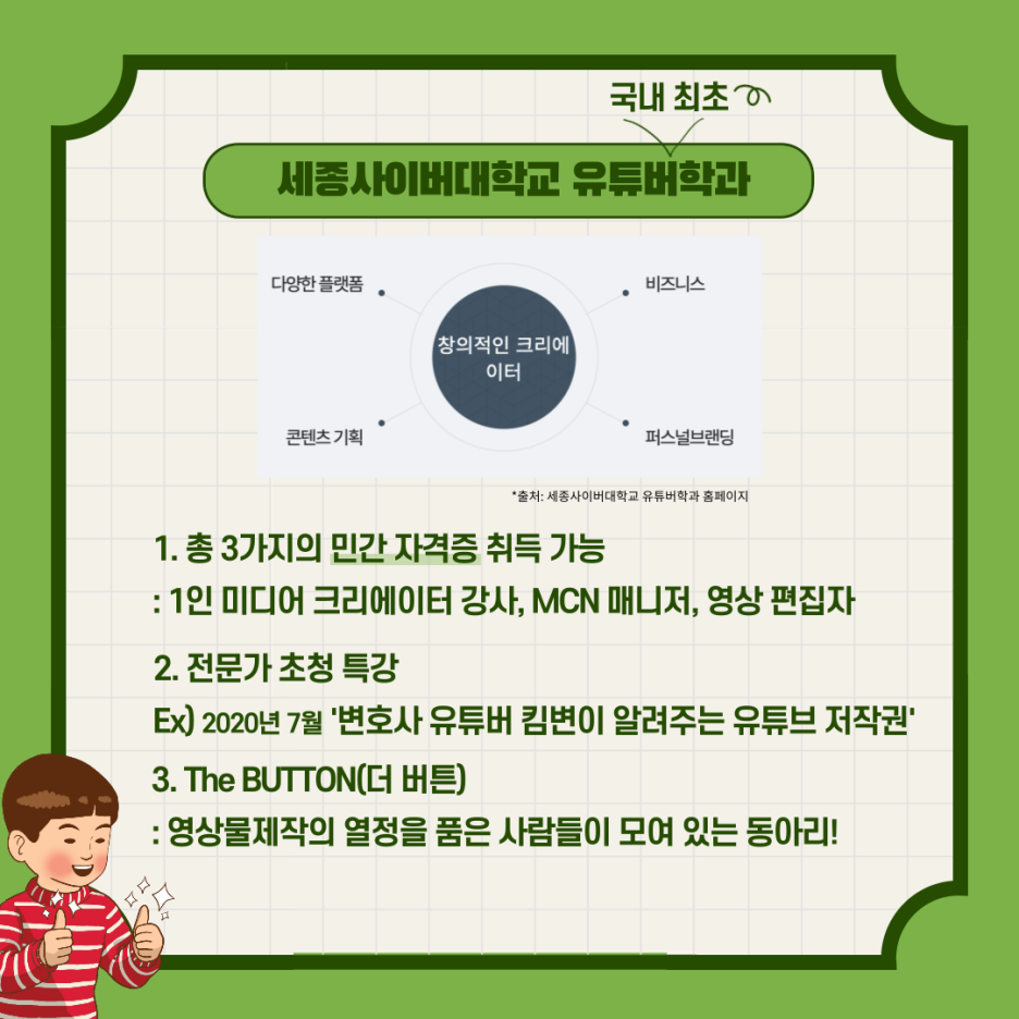 세종사이버대학교 유튜버학과는 "국내 최초" 유튜버학과로, 유튜브, 페이스북, 틱톡 등 플랫폼에서도 활동할 수 있으며 창의적인 1인 미디어 크리에이터로 성장할 수 있도록 다양한 크리에이터 교육을 제공합니다. 유튜버, 크리에이터, MCN과 SNS 분야 등 실무 경험이 풍부한 전문가 위주의 교수진과 더불어 유튜브 크리에이터 교육을 위한 '전문가 초청 특강'을 수시로 개최하기도 한답니다. 참고로 작년 7월에는 변호사 유튜버 킴변이 알려주는 유튜브 저작권 특강도 진행했다고 합니다.