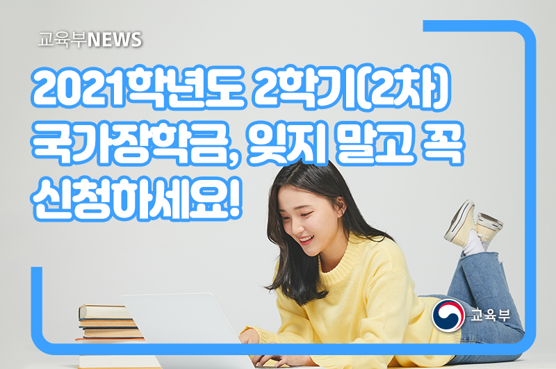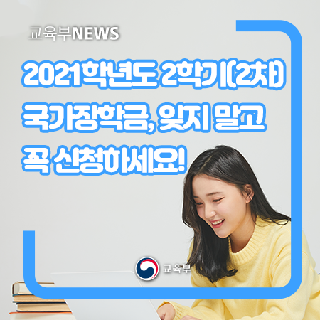 교육부(부총리 겸 교육부장관 유은혜)와 한국장학재단(이사장 이정우, 이하 ‘재단’)은 8월 17일(화) 9시부터 9월 16일(목) 18시까지 2021학년도 2학기 2차 국가장학금 신청을 받는다.