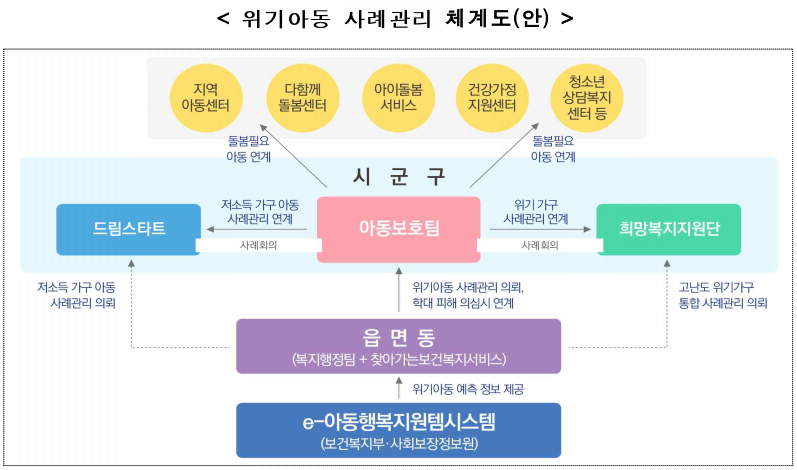 현재 읍면동 복지행정팀이 수행 중인 위기아동 가정 방문조사의 실효성 제고를 위해, 복지 사각지대 발굴을 전담하는 ‘찾아가는 보건복지팀’과의 협업 강화 등을 추진한다.