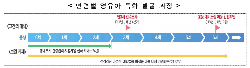 * ‘생애 초기 건강관리 시범사업’ 확대(∼만2세), 건강검진·예방접종 미실시 아동 안전확인 강화(∼만6세)