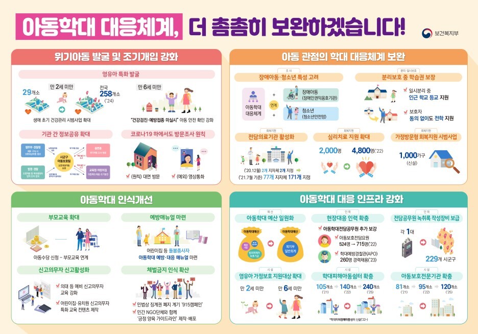 이에 정부는 「아동학대 대응체계 강화방안」의 이행 상황을 점검하고, 예방부터 신고 후 조사 및 보호, 재학대 방지를 위한 회복지원까지 촘촘하게 보완하는「아동학대 대응체계 보완방안」을 마련하였다.
