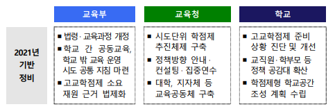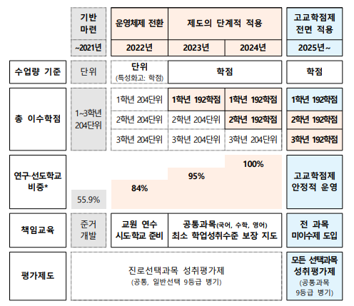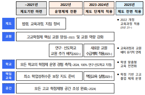 2025년 학생 맞춤형 교육체제의 완전한 안착을 목표로, 고교학점제의 단계적 이행은 2021년 기반 정비를 거쳐 2022년부터 이루어진다.
