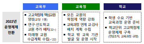 2022년에는 법령‧지침 정비를 토대로 교원 역량 강화, 시도교육청 및 학교단위 추진체제 마련 등 고교학점제 운영체제로의 전환을 중점 추진한다.