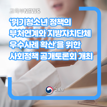 교육부(부총리 겸 교육부장관 유은혜)는 한국직업능력연구원 등 사회분야 연구기관*과 ‘위기청소년 보호·지원정책의 부처연계 강화와 지방자치단체 우수사례 확산’을 주제로 8월 23일(월) 국책연구단지(세종시 소재)에서 제2차 사회정책 공개토론회(포럼)를 온라인으로 개최한다.