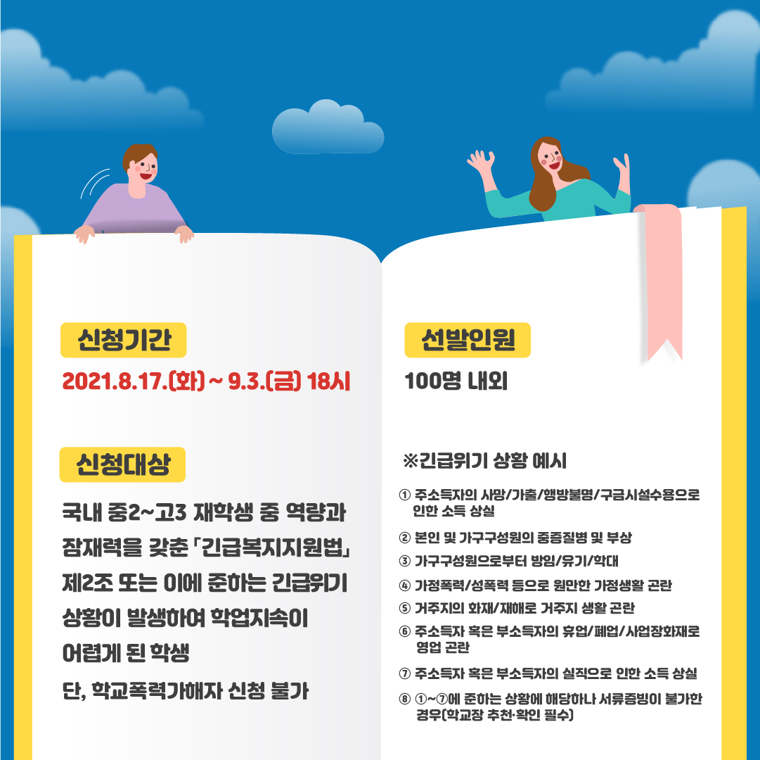 신청대상 : 국내 중2~ 고3 재학생 중 역량과 잠재력을 갖춘 ⌜긴급복지지원법⌟ 제2조 또는 이에 준하는 긴급위기 상황이 발생하여 학업지속이 어렵게 된 학생. 단, 학교폭력가해자 신청 불가