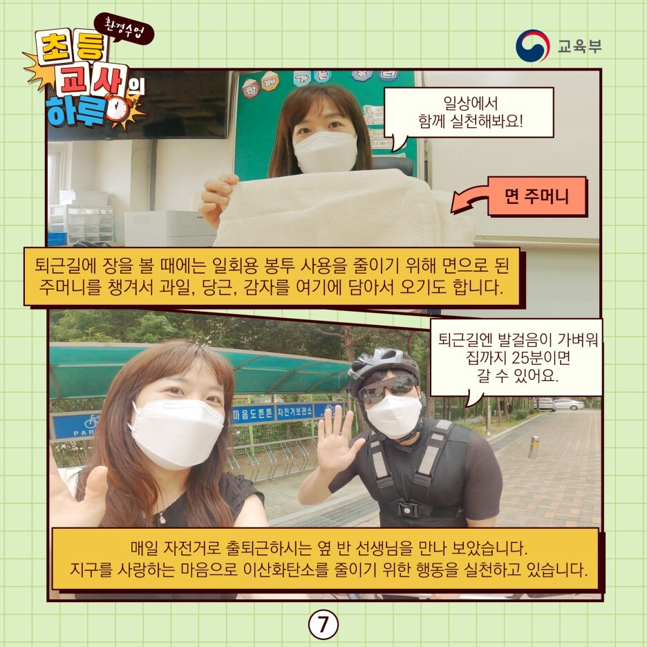 ✔ 매일 자전거로 출퇴근하시는 옆 반 선생님을 만나보았습니다. 지구를 사랑하는 마음으로 이산화탄소를 줄이기 위한 행동을 실천하고 있습니다.
