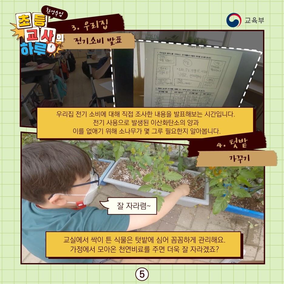 ✔ 교실에서 싹이 튼 식물은 텃밭에 심어 꼼꼼하게 관리해요. 가정에서 모아온 천연비료를 주면 더욱 잘 자라겠죠?