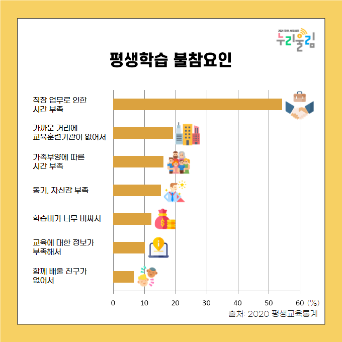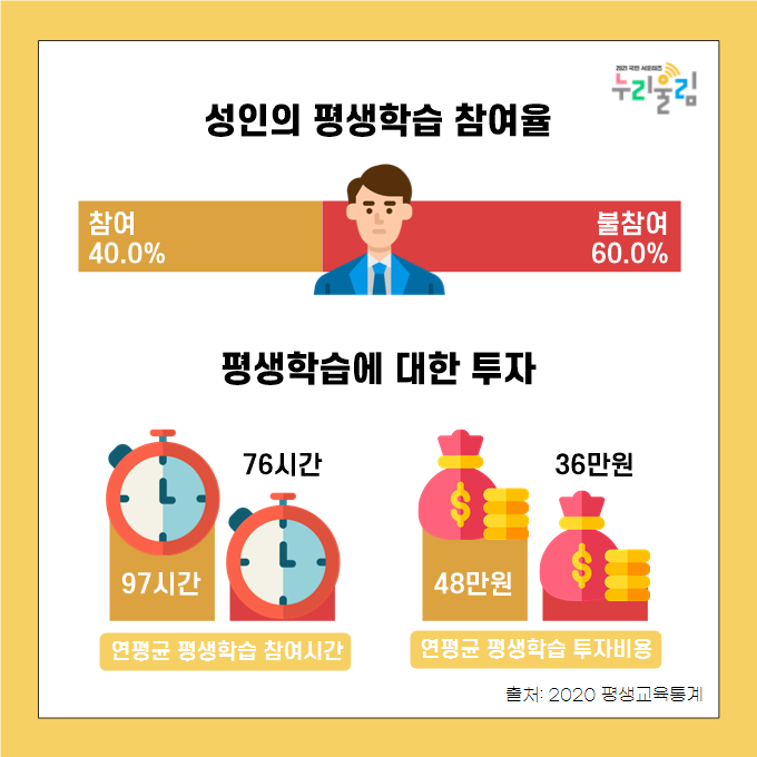 평생교육의 수요자와 공급자가 늘어나는 추세이지만 2020년 평생교육통계에 따르면 아직 한국에서는 성인 중 60%가 평생학습에 참여하고 있지 않습니다. 또한, 2019년에서 2020년 사이에 평생학습의 참여 시간과 투자비용이 감소한 사실을 확인할 수 있었는데요, 그 이유는 무엇일까요?