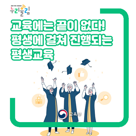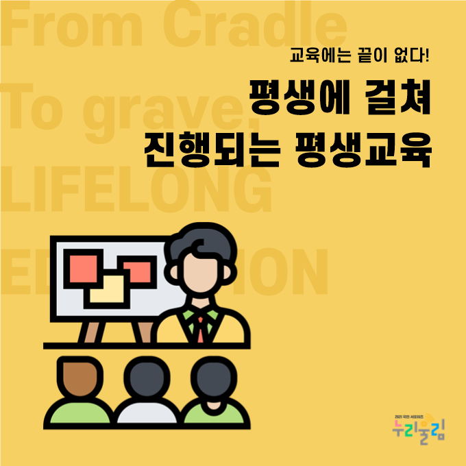여러분은 교육에 끝이 있다고 생각하시나요? 제목에서도 알 수 있듯이 교육은 끝이 없는 것 같습니다. 기술의 발달로 시간과 장소의 제약 없이 누구나 원하는 시기에 교육을 받을 수 있게 되었는데요, 이로 인해 평생교육에 대한 수요는 증가하고 있습니다. 하지만 아직 평생교육이 낯설게 느껴지는 분들도 많을 거라 예상이 됩니다. 따라서 오늘은 요람에서 무덤까지 즉, 전 생애에 걸쳐 진행되는 평생교육에 대해 함께 알아보아요!