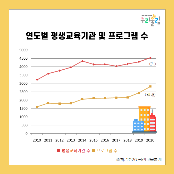 다음으로 평생교육기관의 수와 프로그램 수의 변화입니다. 평생교육기관은 학교의 정규 교육 과정을 제외한, 학력을 보완하거나 지식을 습득할 수 있는 교육 기관을 말하는데요, 위 그래프를 통해 평생교육의 수요자가 늘어나 교육 서비스를 제공해주는 공급 기관과 프로그램 수가 증가하고 있다는 것을 확인할 수 있습니다.