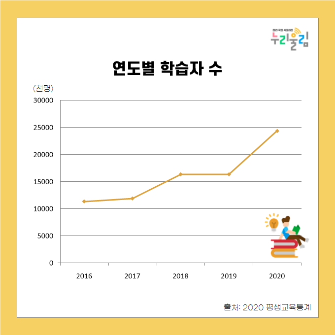 위 그래프는 연도별 학습자 수의 변화를 보여주고 있습니다. 그래프를 보면 연도별 학습자의 수가 증가한 것을 확인할 수 있는데요. 2019년에서 2020년 사이에는 학습자 수가 8,048명이 증가했습니다. 이를 통해 평생교육을 필요로 하는 사람들이 점차 많아지고 있다는 것을 알 수 있습니다.