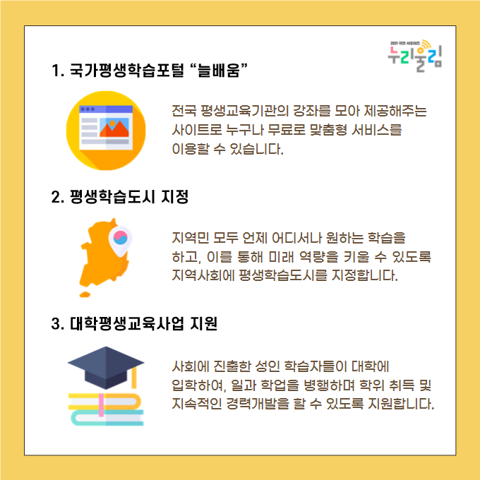 현대 사회를 살아가기 위해 평생교육은 필수이므로 참여 방해 요소를 차단하고, 모든 국민이 쉽게 평생학습에 참여할 수 있도록 국가적 차원의 노력이 필요한데요, 현재 우리나라는 평생교육을 위해 어떤 노력을 하고 있을까요?