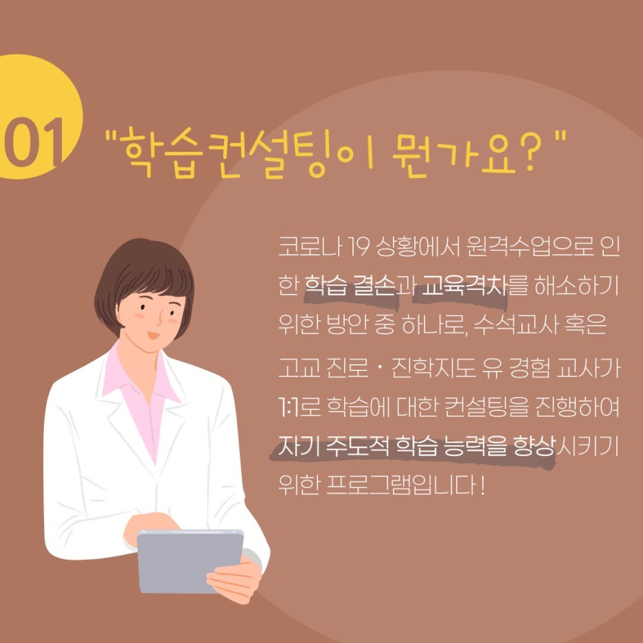‘학습 컨설팅’이란 코로나19 상황에서 원격수업으로 인한 학습 결손과 교육격차를 해소하기 위한 방안 중 하나로, 수석교사 혹은 고교 진로‧진학지도 유 경험 교사가 1:1로 학습에 대한 컨설팅을 진행하여 자기 주도적 학습 능력을 향상시키기 위한 프로그램입니다. 2020년 10월부터 꾸준히 시행해온 학습 컨설팅은 흔히 학업에 대한 흥미를 상실하거나 무기력한 학생들, 또 어떻게 공부를 해야 할지 본인의 방법이 정립되지 않은 학생들과 상담을 진행하여 원인을 파악하고, 맞춤형 유형별 지도를 진행합니다. 그리고 이후에도 학생들이 지속해서 학업을 이어나갈 수 있도록 모니터링을 시행하는 방법으로 이루어집니다. 이뿐만 아니라 각 과목별 학습법도 지도하는 등 직접적인 학습에 관한 컨설팅도 진행하여 학습을 습관화하고 학습과 학업에 대한 자신감을 높일 수 있도록 돕고 있습니다.