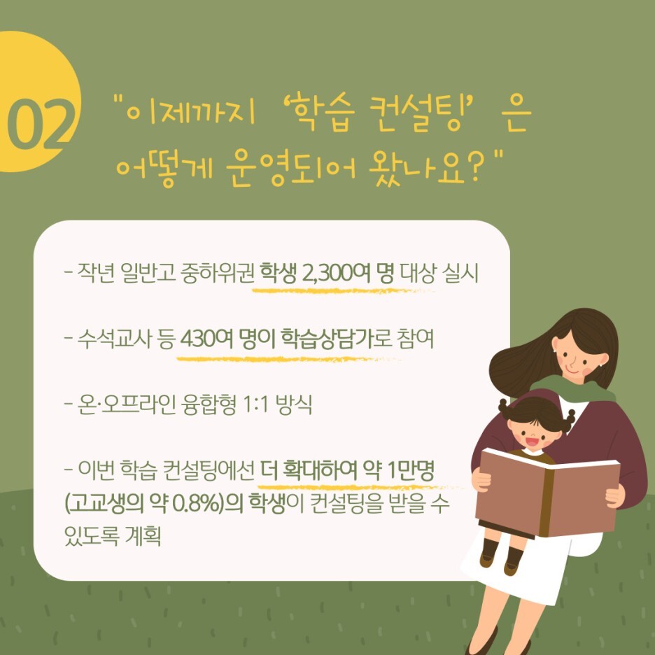 교육부가 제시한 이번 <교육회복 종합방안>에 포함된 ‘학습 컨설팅’도 해당 가이드라인 및 사례집을 활용하여 컨설팅과 상담을 지원할 예정이며 이번 하반기에는 지난 학습 컨설팅보다 더 확대하여 약 1만 명의 학생이 컨설팅을 받을 수 있도록 계획하고 있습니다!
