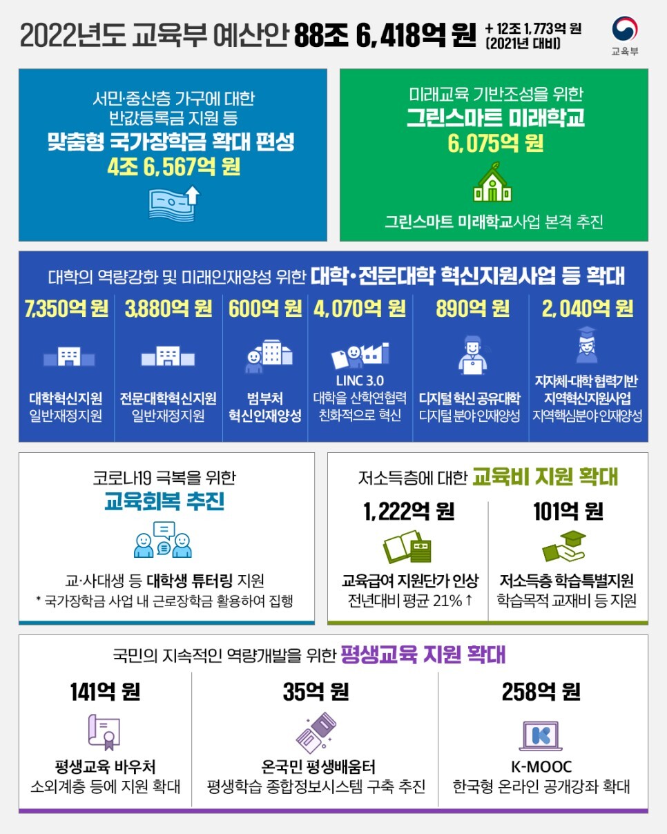 교육부(유은혜 부총리 겸 교육부 장관)는 2022년도 교육부 예산안을 2021년도 예산 76조 4,645억 원 대비 12조 1,773억 원 증가한 88조 6,418억 원으로 편성하였다고 밝혔다.