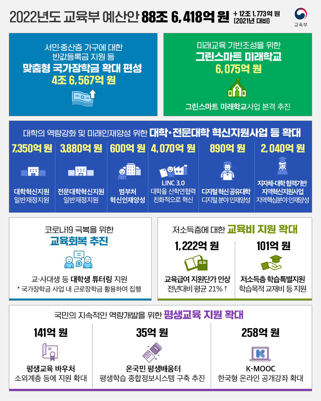 ✔ 코로나19 극복을 위한 교육회복 추진 및 저소득층에 대한 교육비 지원 강화