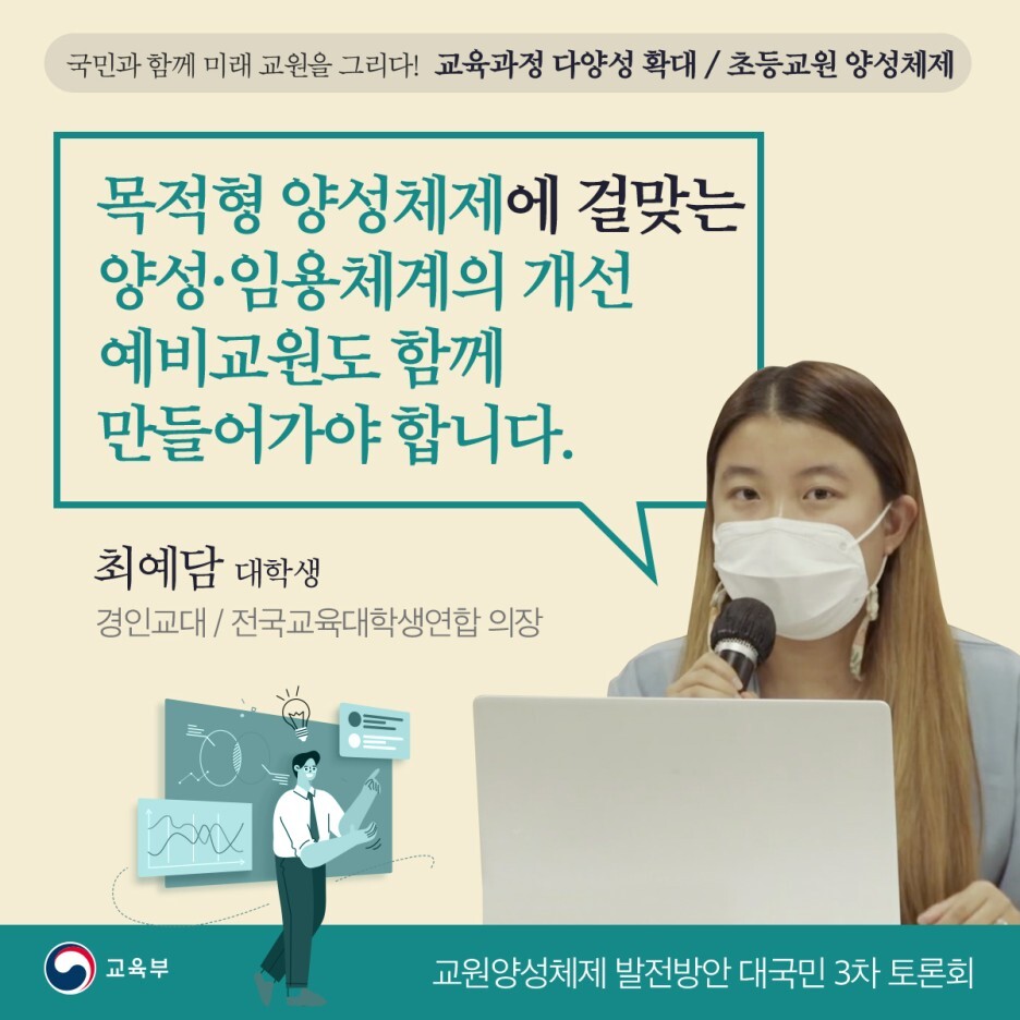적합한 교원 양성을 위하여 국민과 함께 교원양성체제에 대한 발전 방안을 만들고자 진행된 대국민 3차 토론회의 목소리를 전달합니다.