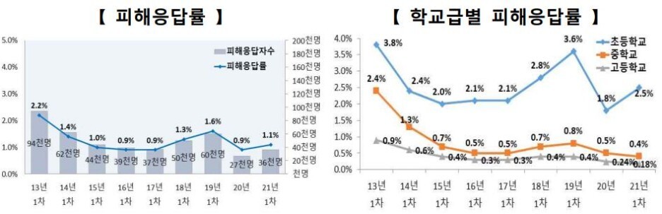 다만, 피해응답률 상승에 영향을 미친 것으로 볼 수 있는 언어폭력 비중의 증가와 중·고등학생에 비해 초등학생의 높은 피해응답률에 대해서는 대책 마련이 필요할 것으로 보인다.