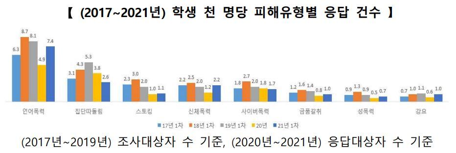 학생 천 명당 피해유형 응답 건수는 2020년 조사와 비교해 언어폭력, 신체폭력은 증가(각각 2.5명, 1.0명)하였고, 집단따돌림, 사이버 폭력은 감소(각각 1.2명, 0.1명)한 것으로 나타났다.
