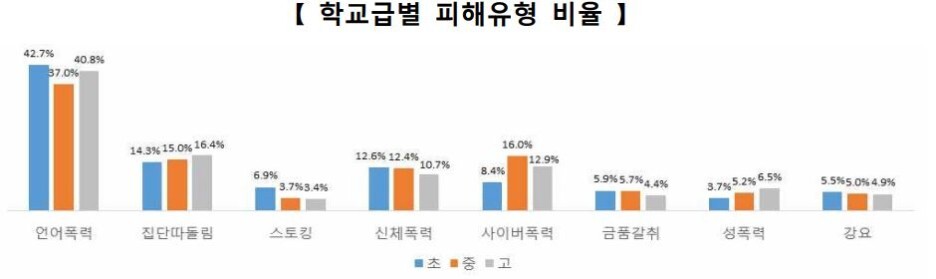 피해유형별 비중은 언어폭력(41.7%), 집단따돌림(14.5%), 신체폭력(12.4%), 사이버폭력(9.8%) 등의 순이며,