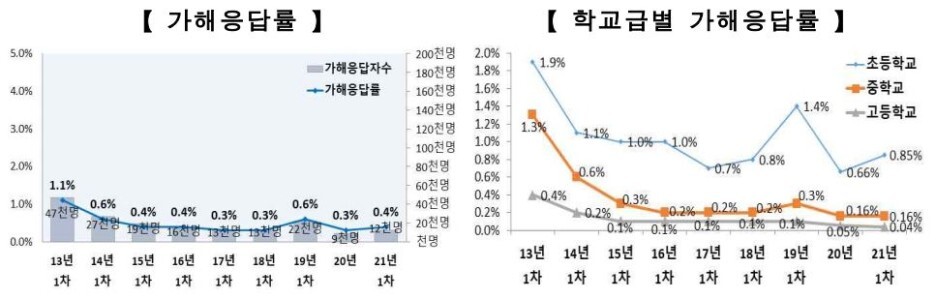 전체 가해응답률은 0.4%(1.2만 명)로, 2020년 조사 대비 0.1%p(0.3만 명) 증가하였으나, 2019년 1차 조사 대비 0.2%p(1만 명) 감소했다.