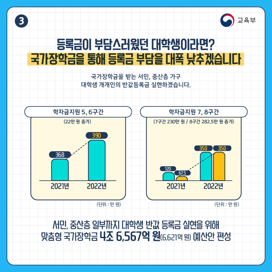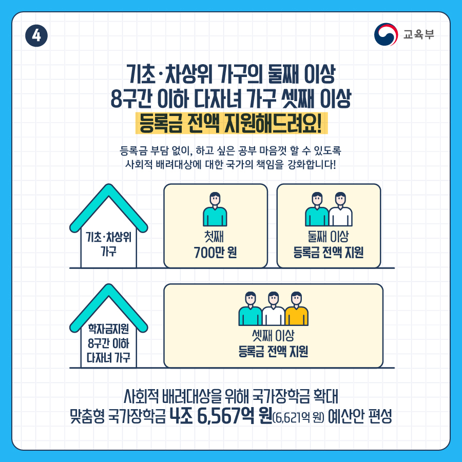 맞춤형 국가장학금 4조 6,567억 원(6,621억 원) 예산안 편성