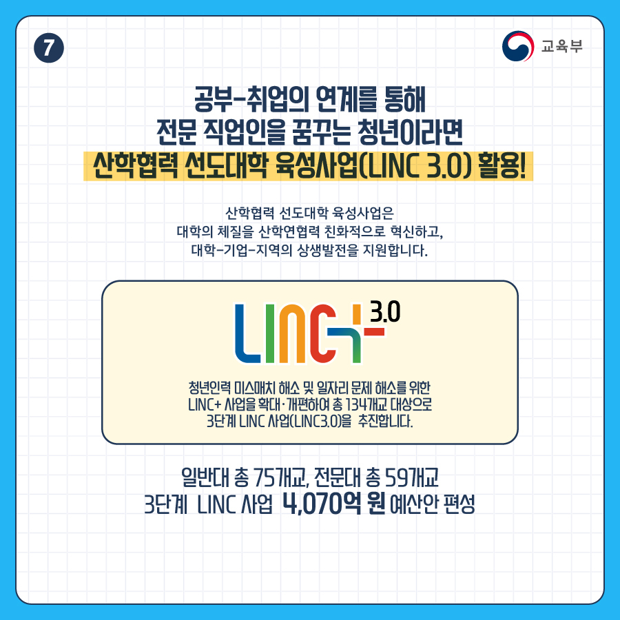| LINC3.0 청년인력 미스매치 해소 및 일자리 문제 해소를 위한 LINC+ 사업을 확대•개편하여 총 134개교 대상으로 3단계 LINC 사업(LINC3.0)을 추진합니다. |