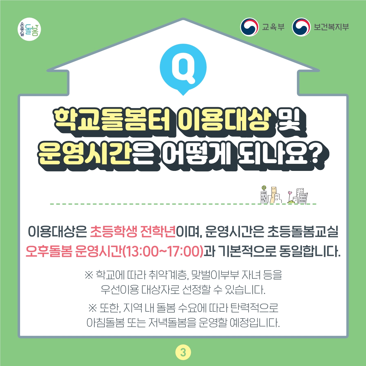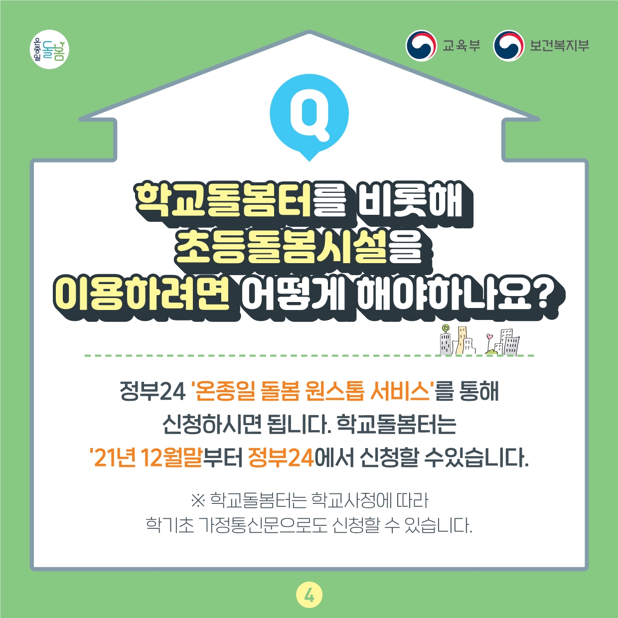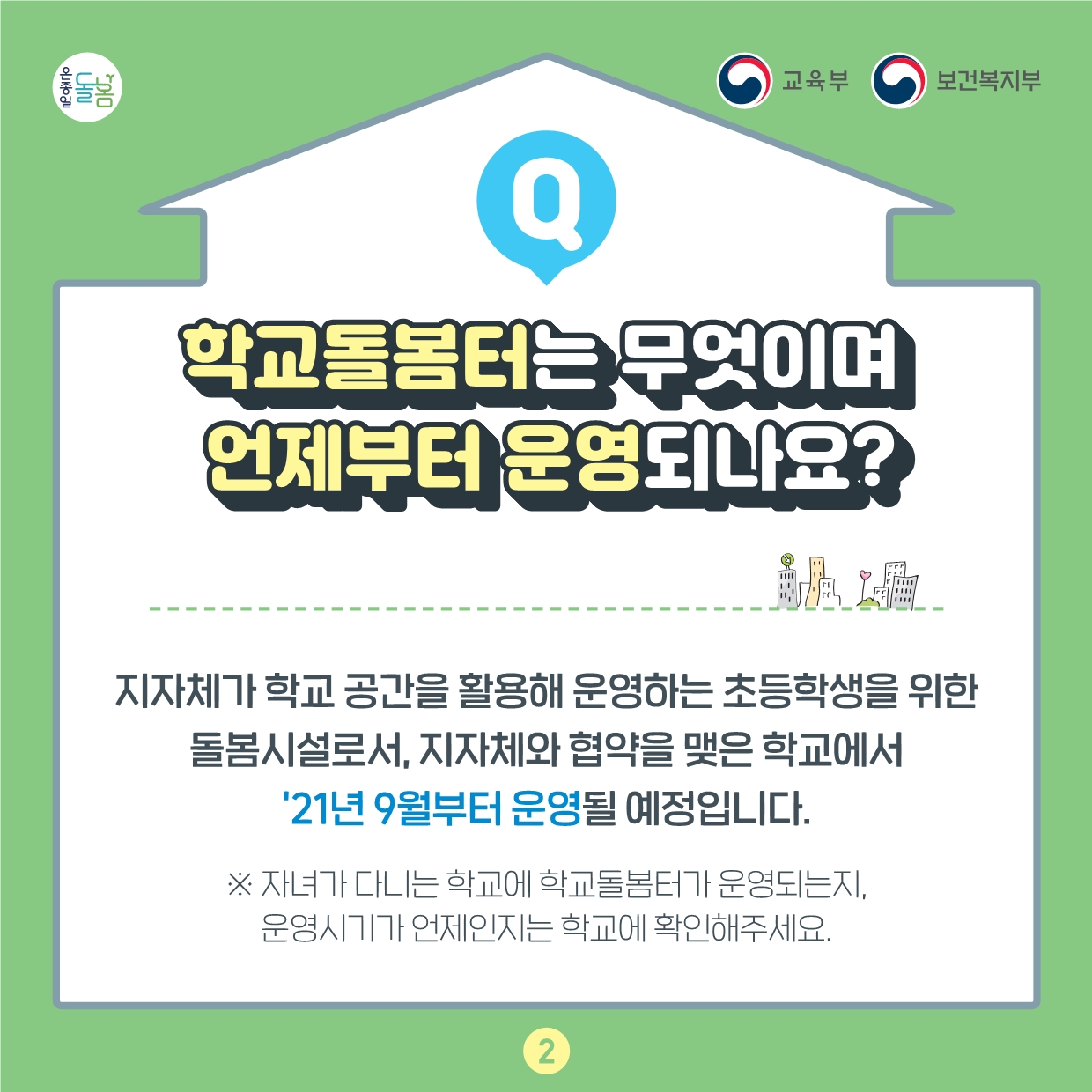 ※ 자녀가 다니는 학교에 학교돌봄터가 운영되는지, 운영시기가 언제인지는 학교에 확인해주세요.