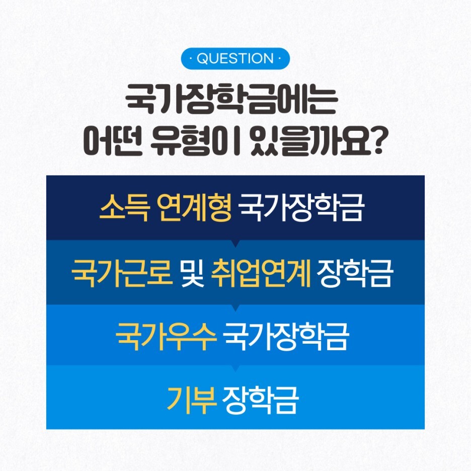 여기서 잠깐! 국가장학금도 정말 다양한 종류가 있다는 사실! 국가장학금은 크게 유형별로 소득연계형 국가장학금, 국가근로 및 취업연계 장학금, 국가우수 장학금, 기부장학금 4가지가 있습니다.