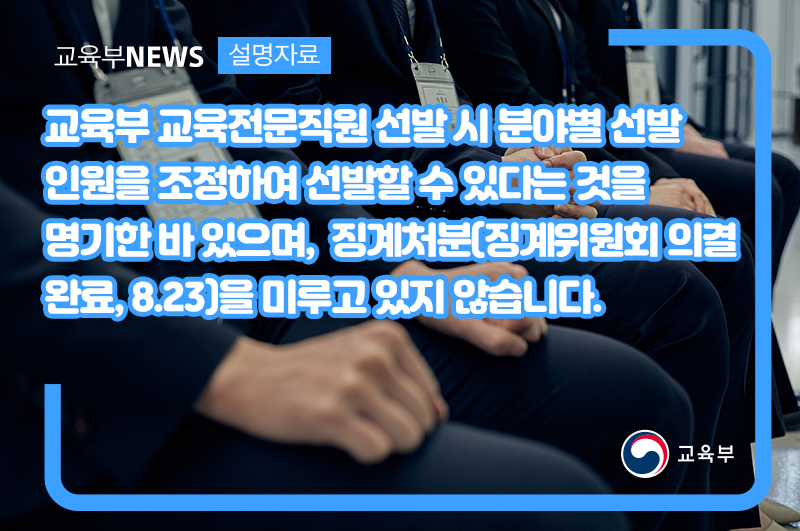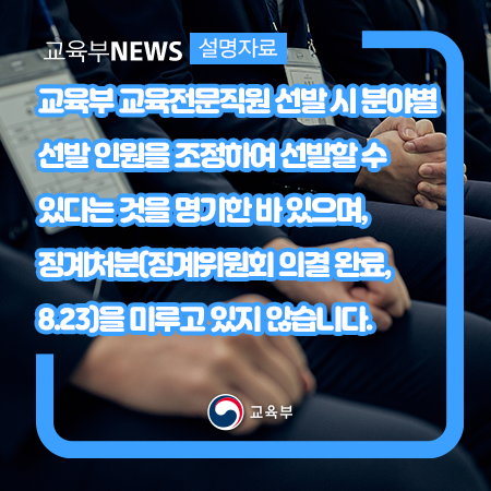 교육부 교육전문직원 선발 시 분야별 선발 인원을 조정하여 선발할 수 있다는 것을 명기한 바 있으며, 징계처분(징계위원회 의결 완료, 8.23)을 미루고 있지 않습니다 본문
