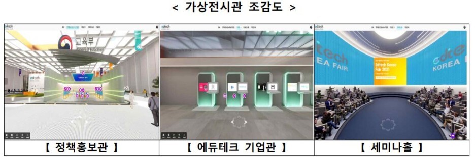 가상전시관 내 교육부 정책홍보관에서는 새로운 교육기술(에듀테크)을 활용한 수업사례 발표 영상, 디지털교과서 실감형콘텐츠(가상현실, 증강현실, 360도 영상) 등을 볼 수 있으며,