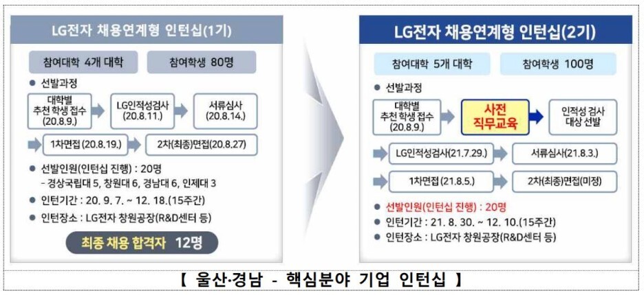 - (경남) 3개 분야 5개 전공 300명 학생을 선발하는 울산경남공유대학(USG+)을 운영(’21.2학기~)하고, LG전자 채용연계형 직무실습(인턴십)을 운영하여 20명 중 12명 채용