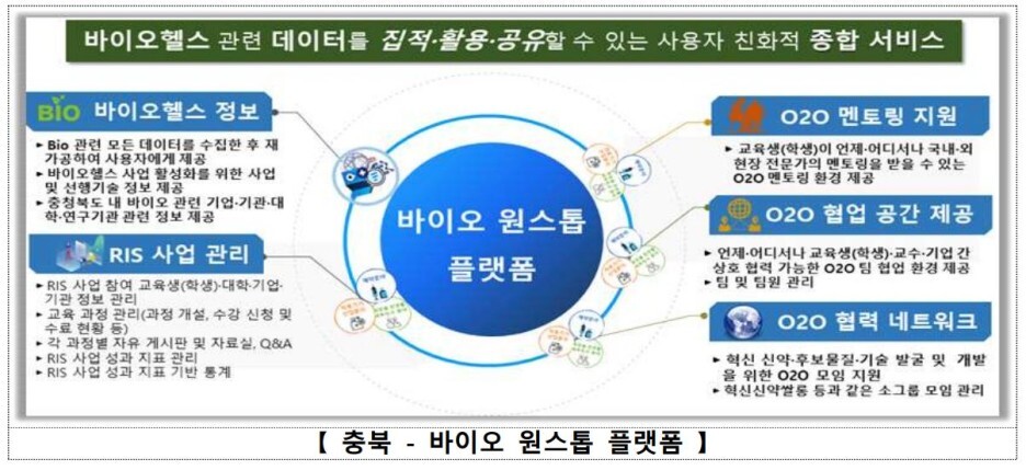 충북은 체계적인 바이오헬스분야 인재양성을 위해 충북산학융합본부를 중심으로 충북대 등 11개 대학 및 지역혁신기관이 인적·물적 자원, 취·창업 등 정보 공유 서비스를 제공하는 정보통합관리망(원스톱플랫폼)을 구축하였다.