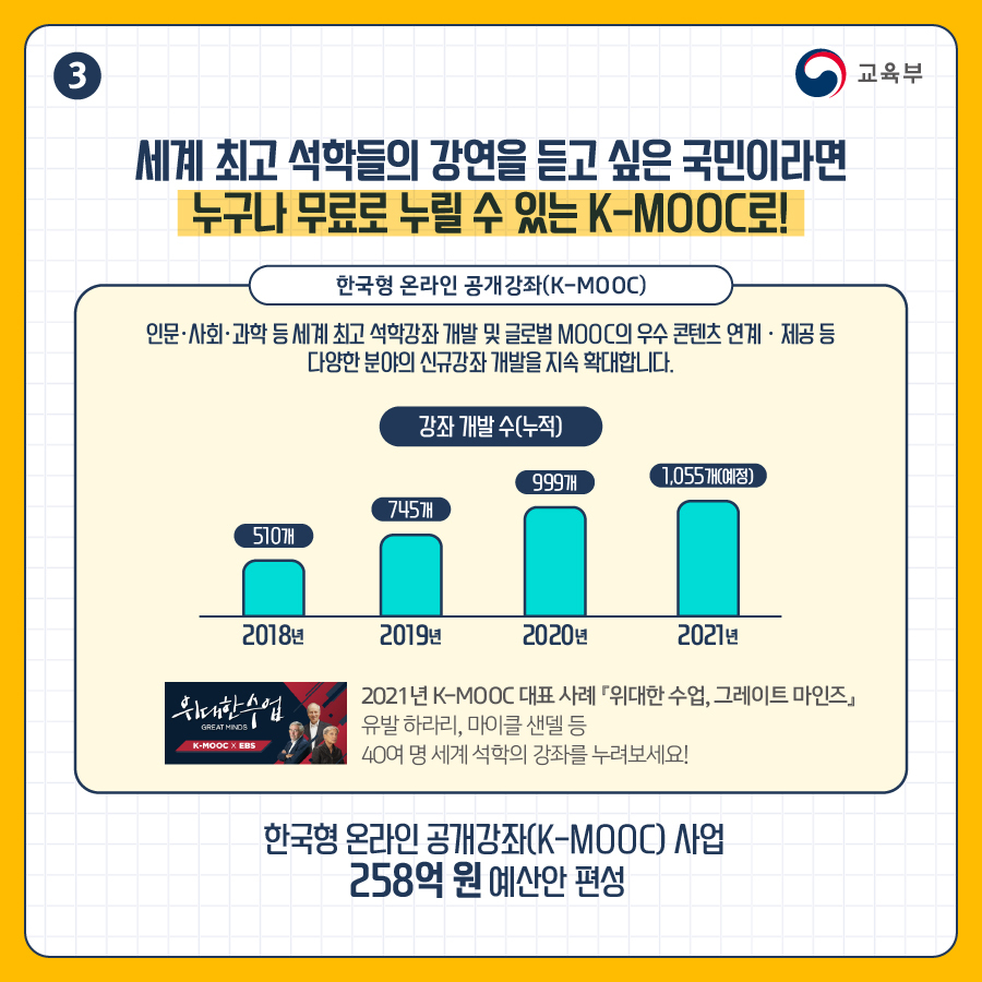 한국형 온라인 공개강좌(K-MOOC)사업 258억 원 예산안 편성 |