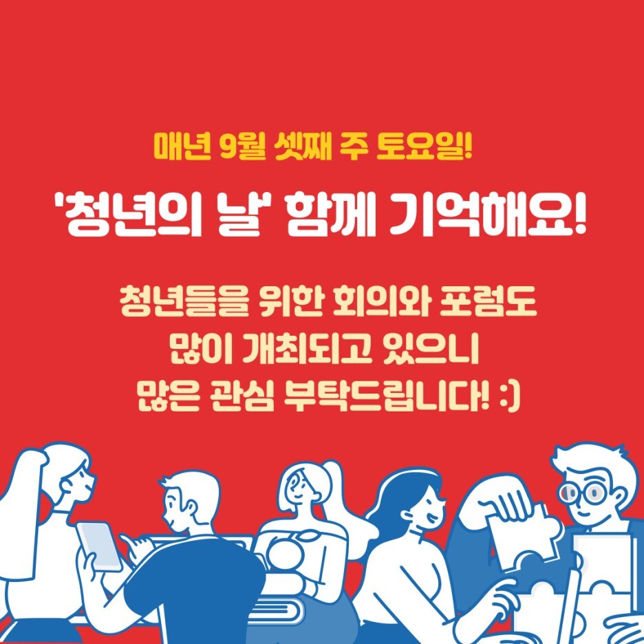 미래를 이끌어갈 대한민국의 청년들이 9월 셋째 주 토요일인 ‘청년의 날’을 기억하고 우리 청년들을 위해, 또 우리 청년들에 의해 개최되는 다양한 포럼과 회의에 참여해서 우리들의 권리와 행복을 적극적으로 찾아 나아가면 좋겠습니다!