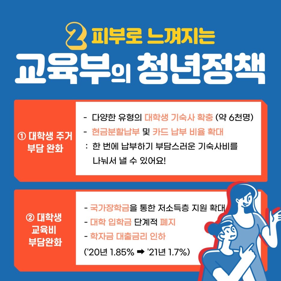교육부에서는 2021년 청년들이 직접 실감할 수 있는 청년정책을 마련했습니다. 청년정책을 쭉 둘러보면 특히 ‘고졸 청년부터 대학원생까지 다양한 청년들이 현재 많이 안고 있을 고민과 문제에 집중했구나!’ 하는 걸 느낄 수 있었답니다!