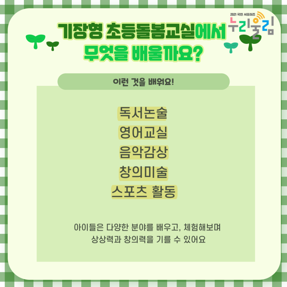 그렇다면 아이들은 기장형 초등돌봄교실에서 어떤 것을 배울 수 있을까요? 독서논술, 영어교실, 음악감상, 창의미술, 스포츠 활동 등 다양한 프로그램이 있어서 아이들은 여러 분야를 배우고, 체험해보며 상상력과 창의력을 기를 수 있다고 합니다.